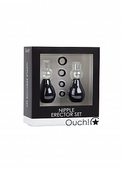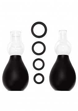 Keep your nipples stiff and sensitive with this nipple erector set and experience pumping pleasure! To start, take the pump with the smallest opening. Slide the rubber ring of your choice over the opening and place it on your nipple. Squeeze the air reservoir until you reach the desired result. Slide the rubber ring around your nipple to keep it hard and sensitive. Repeat these steps with your other nipple. To get the nipples even bigger, use the pump with the wider opening. Have fun!