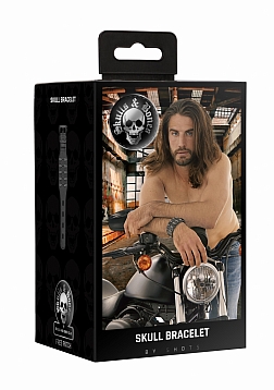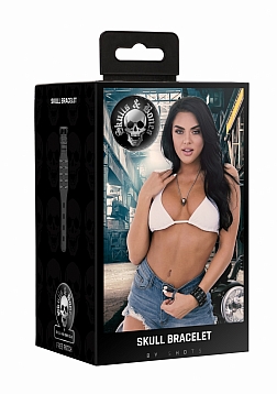 Two rows of little skulls and a double clasp complete this impressive arm band! Made of high-quality black Bonded Leather and dark grey metal, this is a seriously well-made bracelet!