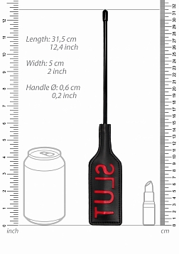 Leave a lasting impression on your partner. This short handled rectangular shaped crop is the perfect way to discipline your partner. Leave a lasting impression on your sub. The word SLUT is reversed so it will show up on their skin