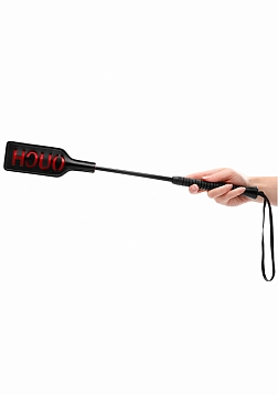 Leave a lasting impression on your partner. This short handled rectangular shaped crop is the perfect way to discipline your partner. Leave a lasting impression on your sub. The word OUCH is reversed so it will show up on their skin