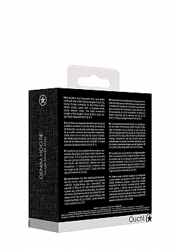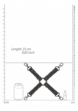 Combine your favourite wrist and ankle cuffs with this 4-WAY Denim Hogtie Cross. Full body restraint has never been so easy, just clip your sub's arms and legs behind their back, or in front, for total control and submission! This Denim Hogtie will look absolutely amazing in any BDSM, beginners, as well as advanced players, collection! The sturdy O-ring connects to four heavy-duty denim straps, each with a stainless steel, quick release clasp. Just clip them onto (Ouch) hand and ankle cuffs and you're ready to play. This sturdy fabric will seamlessly blend in with anything you wear during your kinky role play! The popular world of Ouch! Denim will keep your sub secure while looking fiercely fabulous! The total maximum length of the hogtie is 25cm (9.85"). Each single strap measures 8cm (3.15").
