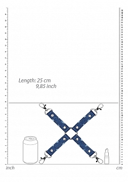 Combine your favourite wrist and ankle cuffs with this 4-WAY Denim Hogtie Cross. Full body restraint has never been so easy, just clip your sub's arms and legs behind their back, or in front, for total control and submission! This Denim Hogtie will look absolutely amazing in any BDSM, beginners, as well as advanced players, collection! The sturdy O-ring connects to four heavy-duty denim straps, each with a stainless steel, quick release clasp. Just clip them onto (Ouch) hand and ankle cuffs and you're ready to play. This sturdy fabric will seamlessly blend in with anything you wear during your kinky role play! The popular world of Ouch! Denim will keep your sub secure while looking fiercely fabulous! The total maximum length of the hogtie is 25cm (9.85"). Each single strap measures 8cm (3.15").