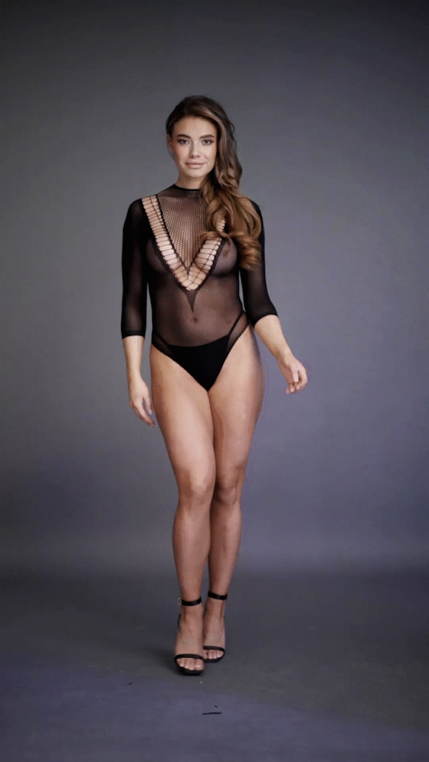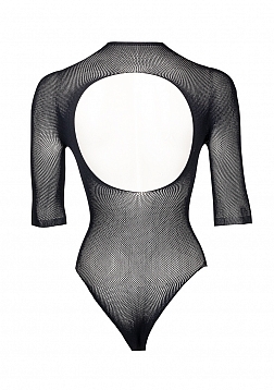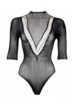 Round neck fishnet body with contrast V-neckline. The body has short sleeves and a keyhole at the back. This bodys fits size S-XL. Thong not included. Thong not included.