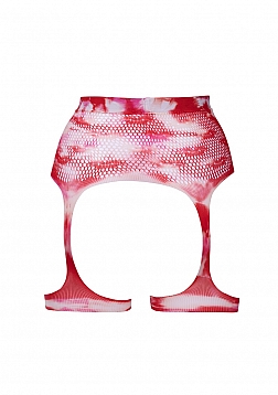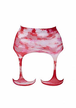 Fishnet suspender belt/garter belt with "kiss" pattern and attached suspenders/garters. This item fits sizes S-XL. For the ultimate sexy feeling wear these over a bikini, shorts or a dress and add the Dazzling Deep-V Cleavage Bling Sticker. Or don't wear anything underneath for a sexy adventure.