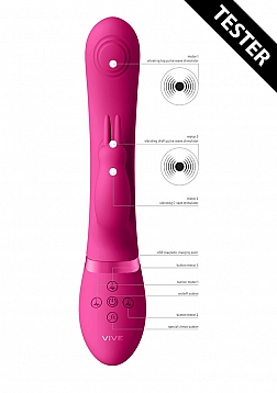 The unique design of the VIVE045 Dual Pulse Wave Rabbit vibrator makes it stand completely apart from other devices.Three independently controlled New Generation F1 10 speed/function motors power this beautifully designed vibrator.There is a Pulse wave G-spot motor function, an outer clitoral Rabbit function, and a unique one-of-a-kind INNER clitoral stimulating Pulse wave motor.This is a game-changer.With over 1000 different combinations this toy will bring you to places never dreamed of. When you're getting close to climax, just one touch of the special function climax button will immediately bring all the motors to full power/speed.The fully USB magnetic rechargeable medical-grade silicone vibrator boasts a 60-minute battery life and is totally waterproof (IPX7) which means you can enjoy this toy anywhere you want. All VIVE vibrators come with a 1-year warranty.