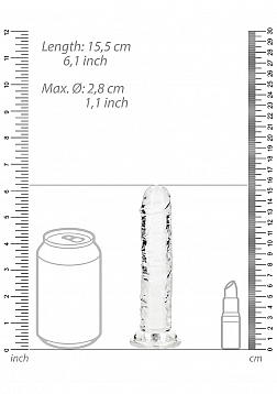 This model stands 6.1” (15,5 cm) tall including the suction cup, has an insertable length of 5.7” (14,5 cm) and has a girth of 1.1” (2,8 cm).