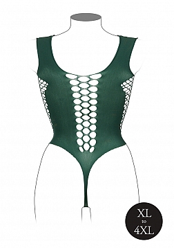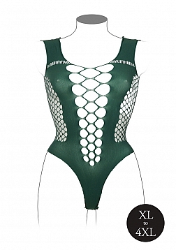 Teddy with a combination opaque and net. It has a deep-V neckline. This teddy has some stretch and can be worn from size XL to 4XL.