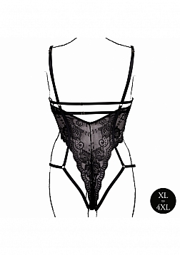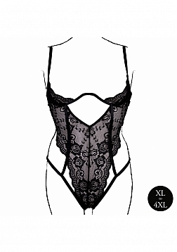 Release your inner seductress with our stunning lace open cup underwired bodysuit that will accentuate your curves and ignite passion. This exquisite piece features beautiful lace detailing that adds a touch of romance, while the underwired cups provide support and accentuate your silhouette. The adjustable sliders ensure a perfect fit so that you feel secure and comfortable with every movement. The bodysuit beautifully accentuates your hips and shows off your back. It creates an irresistible shape that captivates from every angle. Perfect for intimate evenings or special occasions, this bodysuit invites you to show off your sensuality. Slip into this enchanting piece and let it be your secret to creating unforgettable moments full of seduction and desire. Available in sizes XL to 4XL.